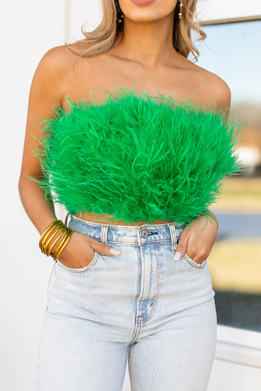 Fancy Strapless Feather Crop Top - Green