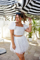 Grab a glass of bubbly and get ready to celebrate all night in the Cutie Set! The Cutie Set features a puffed sleeve pleated cropped top with a smocked back panel and an elastic back flowy skirt.