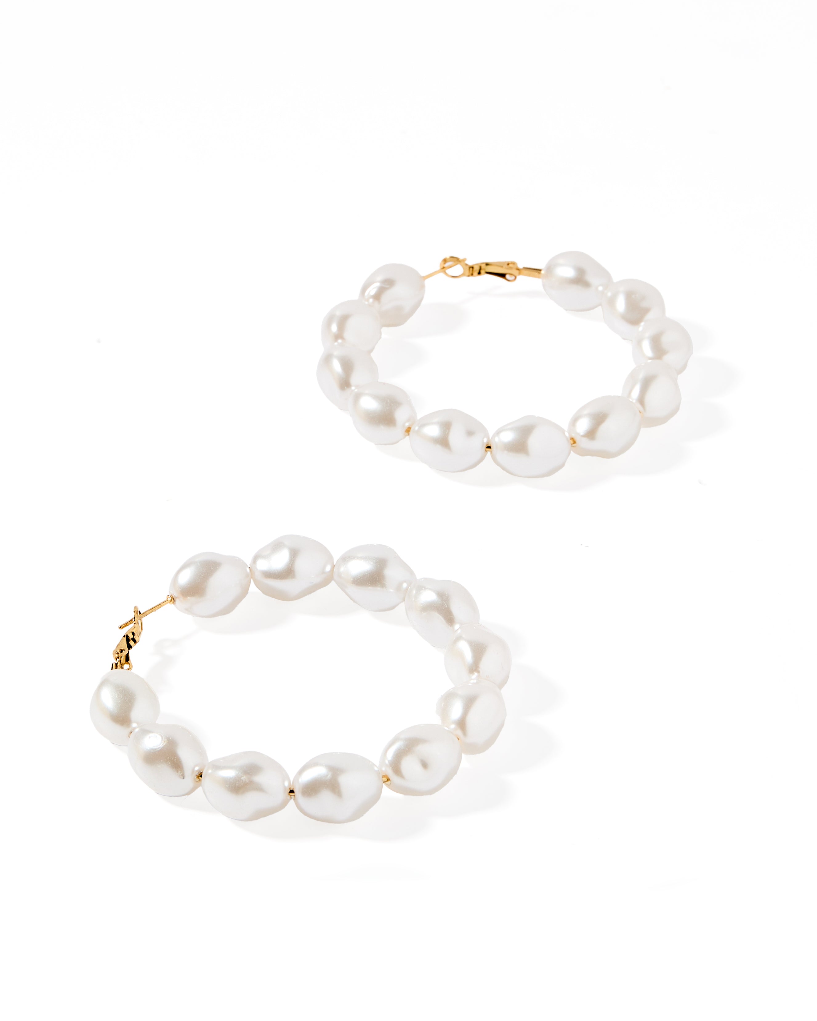 The Macy hoop is a 65mm oversized pearl hoop. Shockingly light-weight, makes a mega statement.