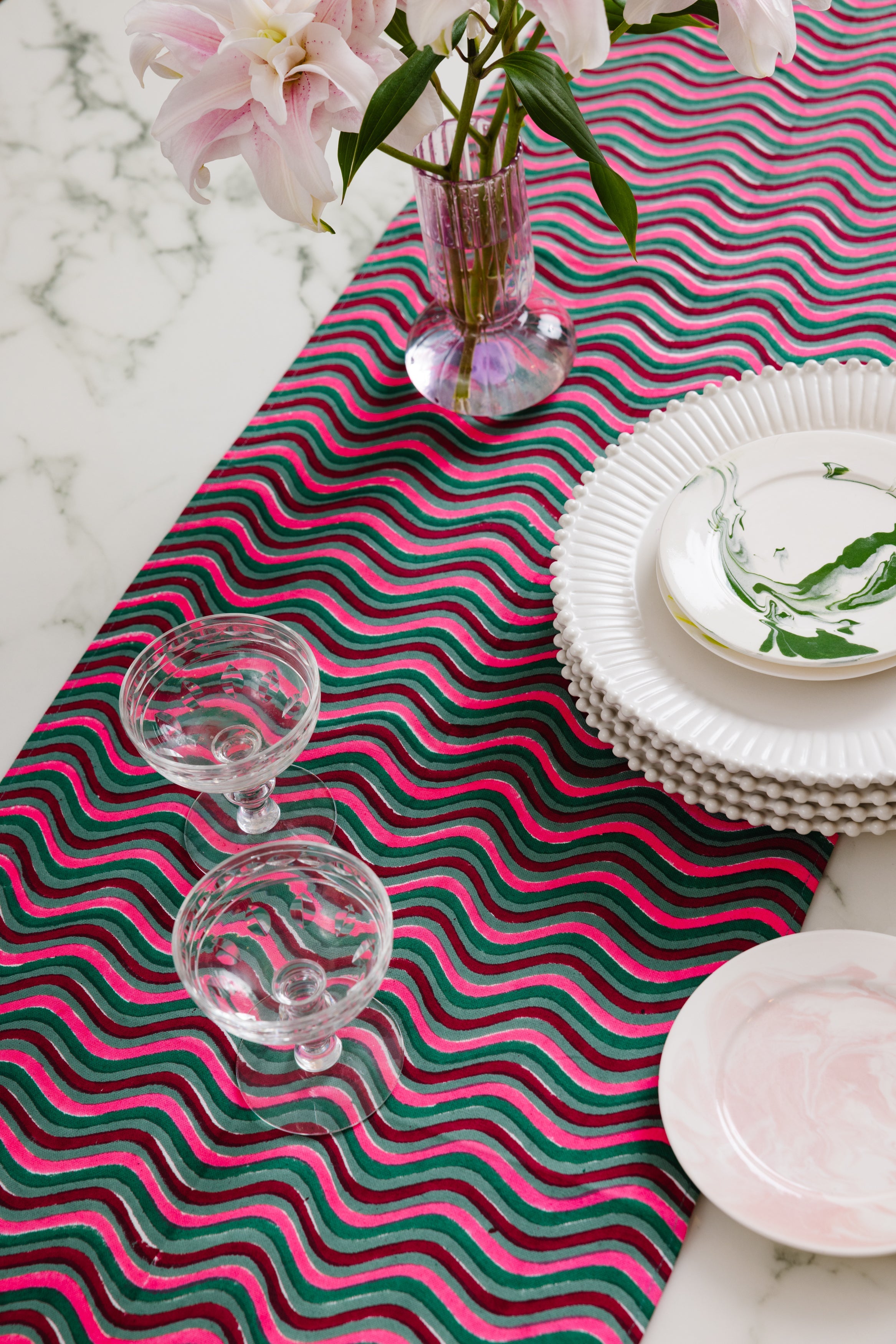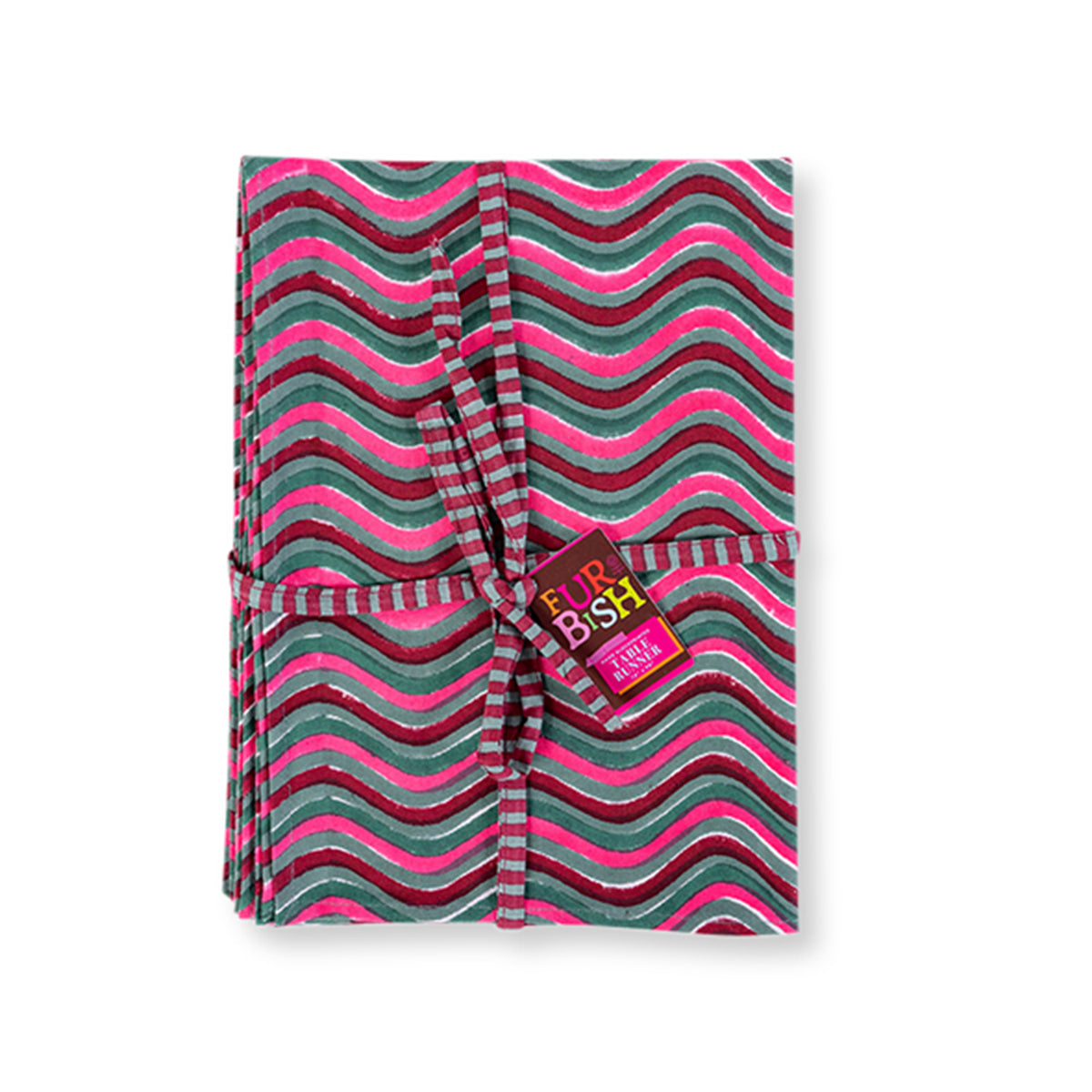 Make your meals extra festive with our exclusive blockprint table runners. Handmade in India, the charming color combo and the striped scalloped trim make a bold statement. By opting for sustainable table linens over disposable, we can help cut down on waste and support an age-old craft by artisans in Jaipur.