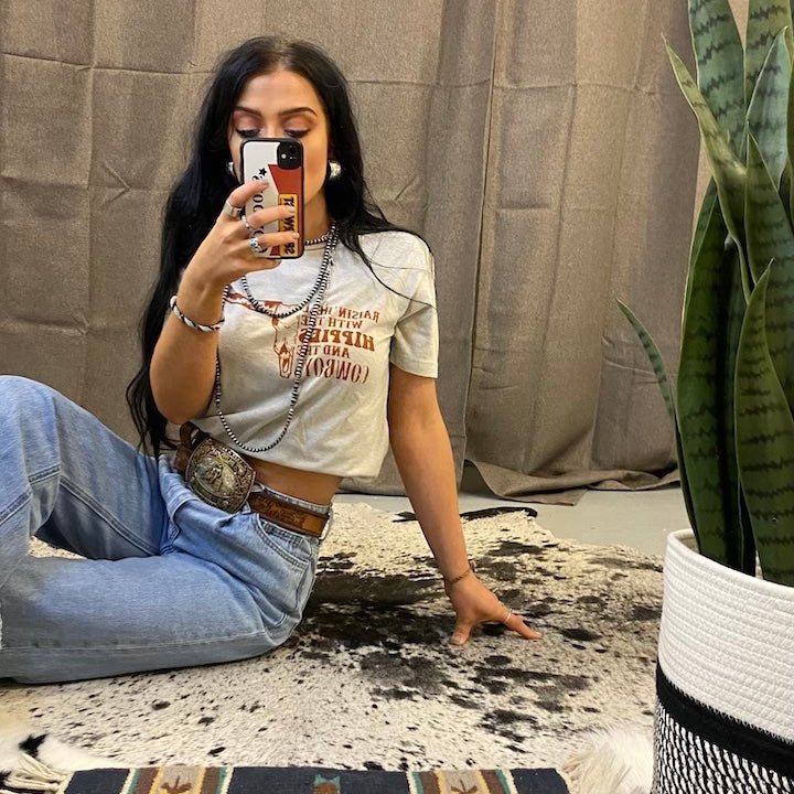 If you like raisin’ a little hell then our new Raisin’ Hell Bull Skull Graphic Tee was made for you! Printed on a unisex Bella Canvas tee you’ll fit right in with the hippies and cowboys. Add some jewelry and denim to complete the ultimate cowgirl fit!
