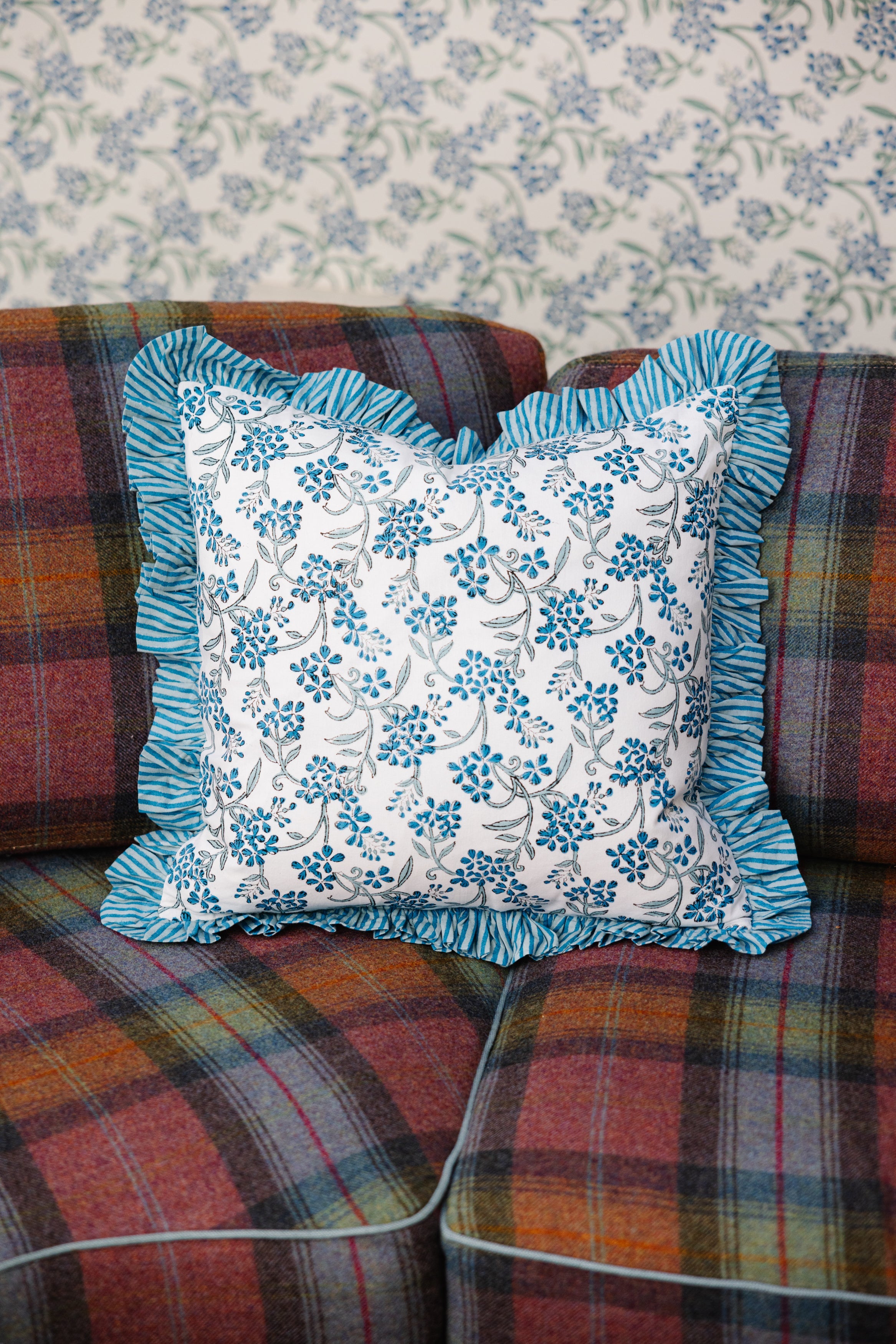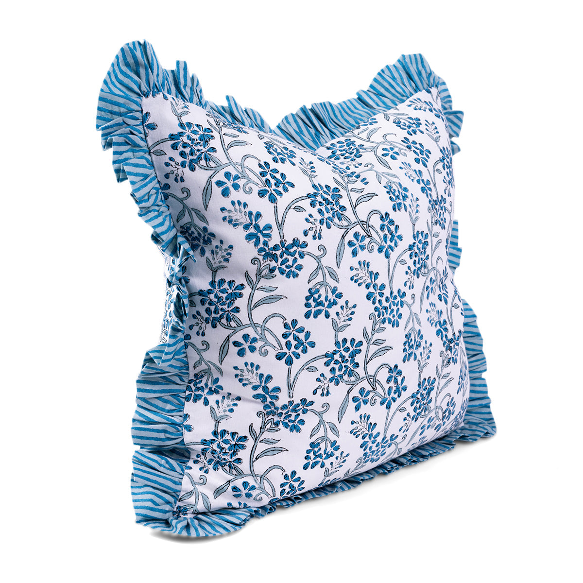 Hand printed in India, our bold blockprint pillows with ruffled edges are the perfect luxe layer to add to your mix. Bright colors with a contrast striped trim makes for a signature look.