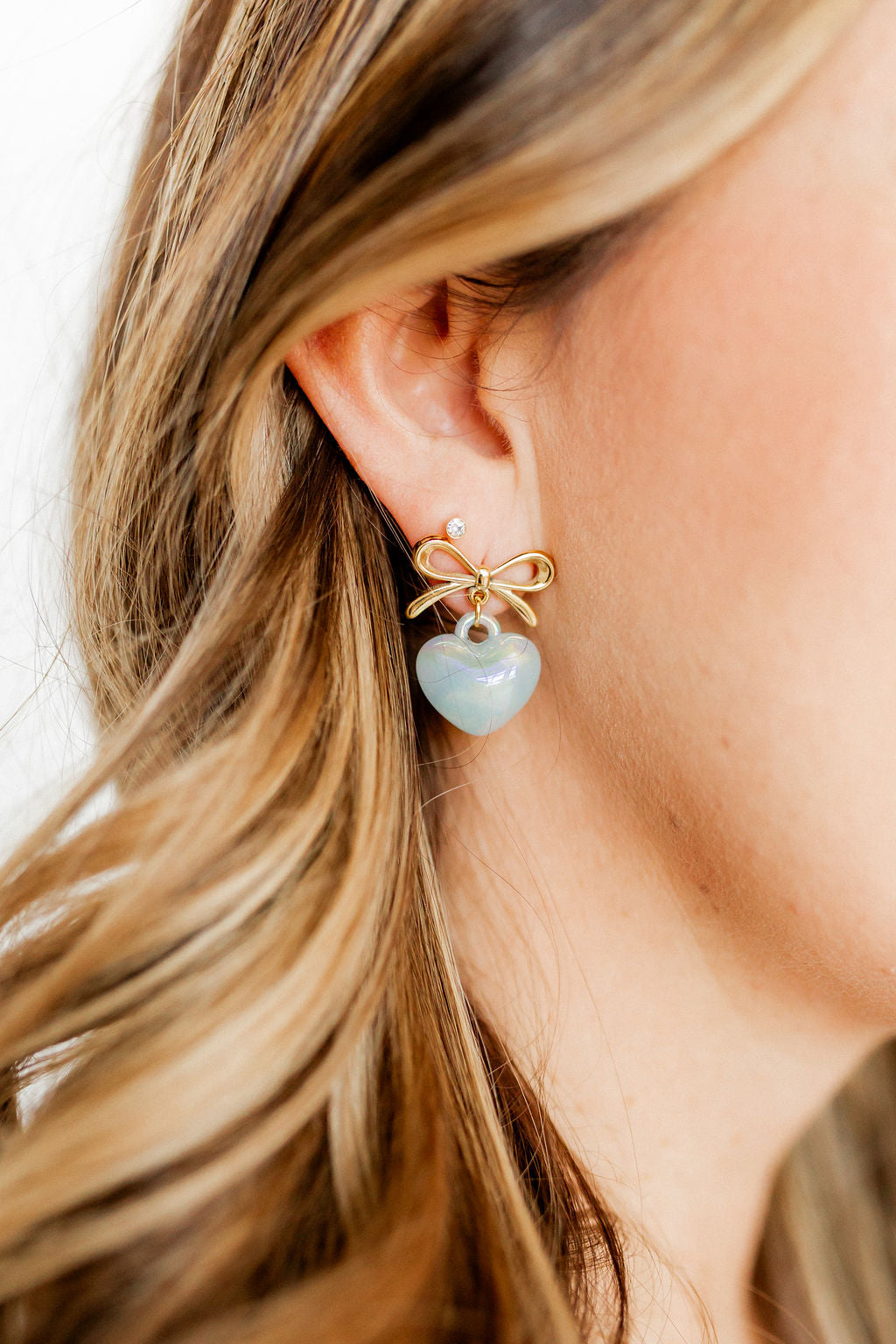 The Ruthie earring is a gold-plated stainless steel bow pendant earring with an acrylic bubble heart. She is 23mm long in size and is a light-weight staple for every stylish gal.