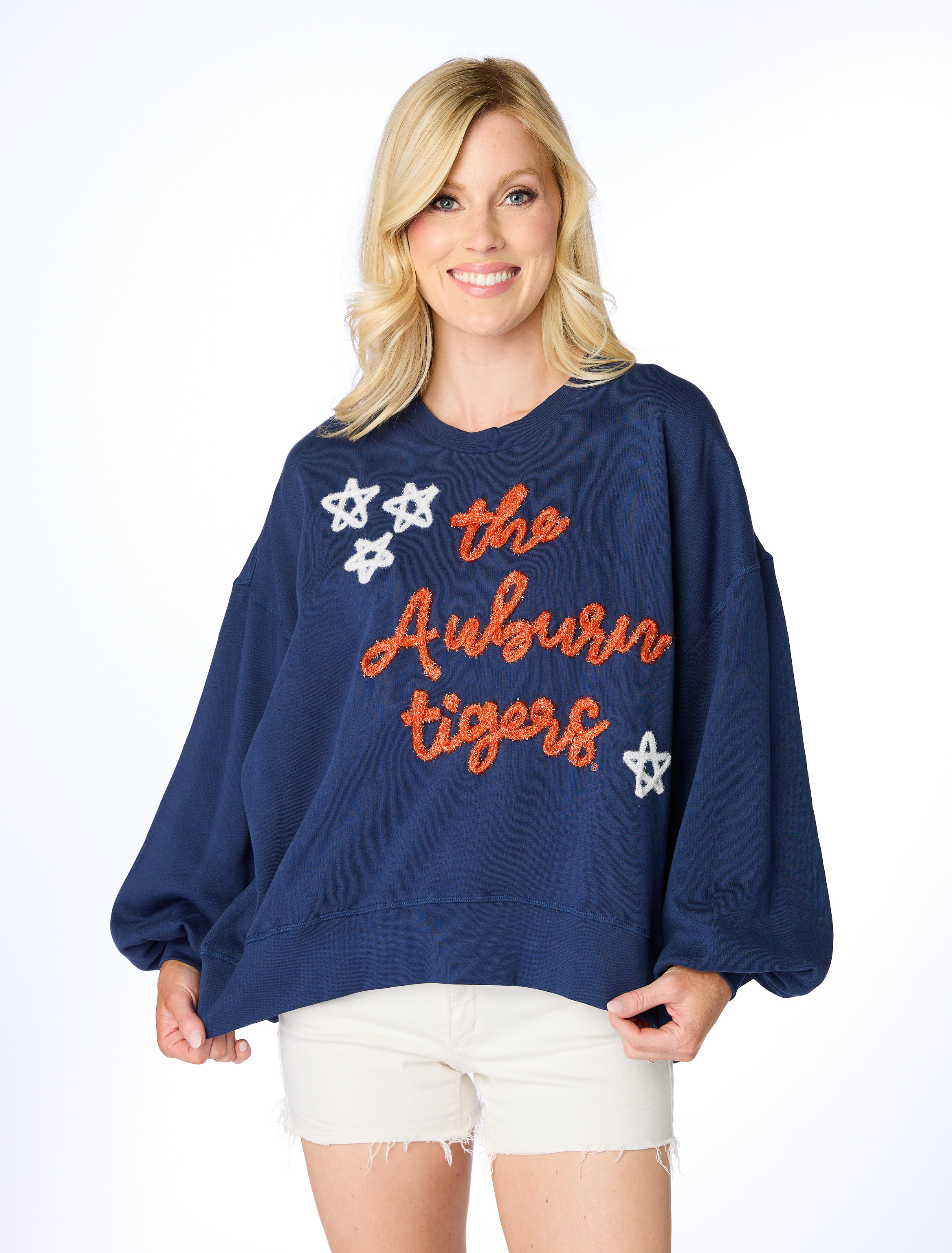 Your favorite balloon pullover makes a statement with oversized glitter piping and stars! This top is officially licensed so a portion of your purchase directly supports the university.