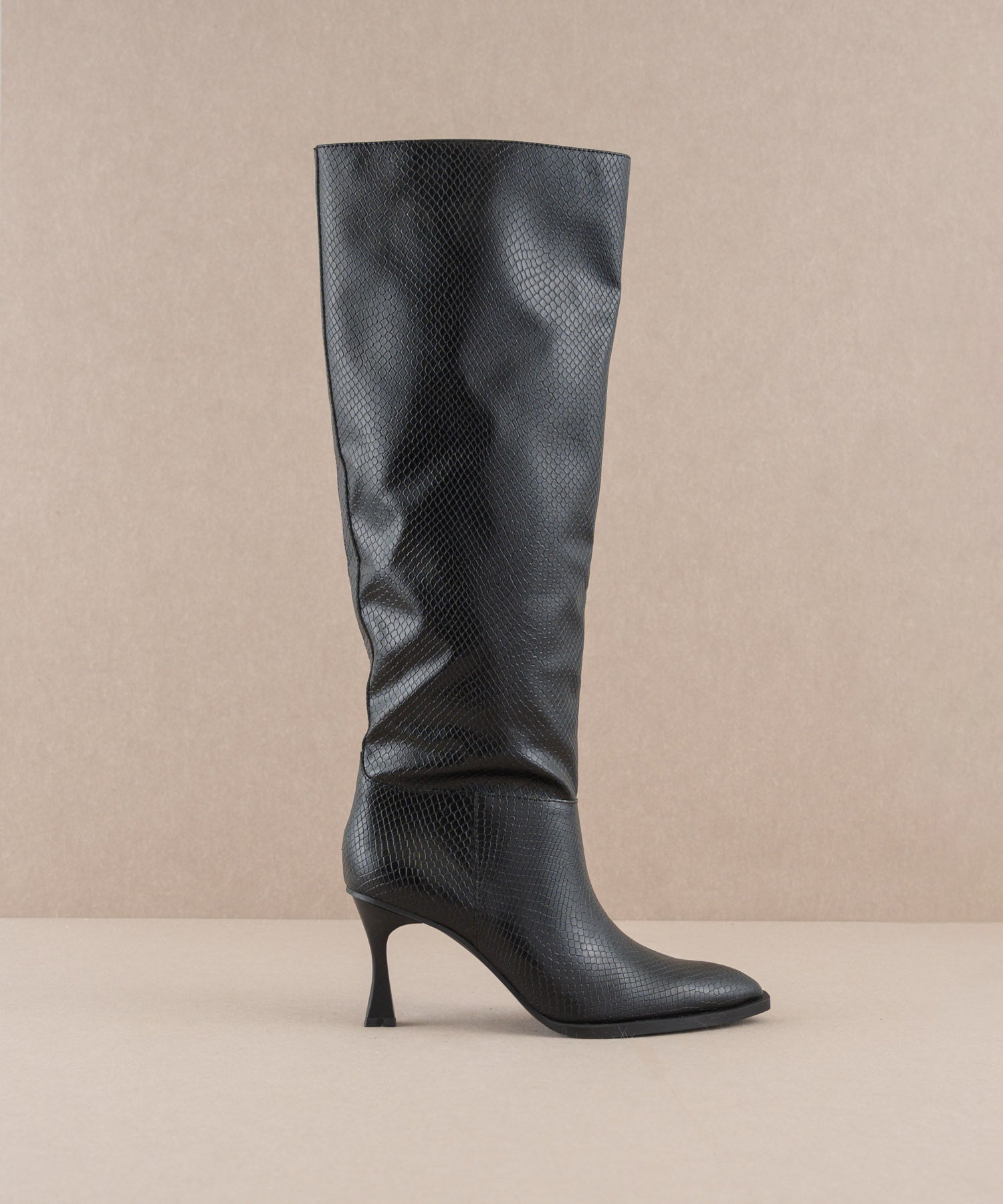 This is a FINAL SALE item. Stand out in a crowd in these knee high reptile print boots. Balanced on a dainty pyramid heel, these are turning heads everywhere you go.