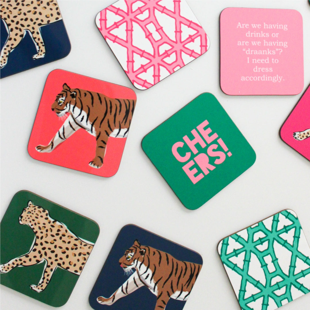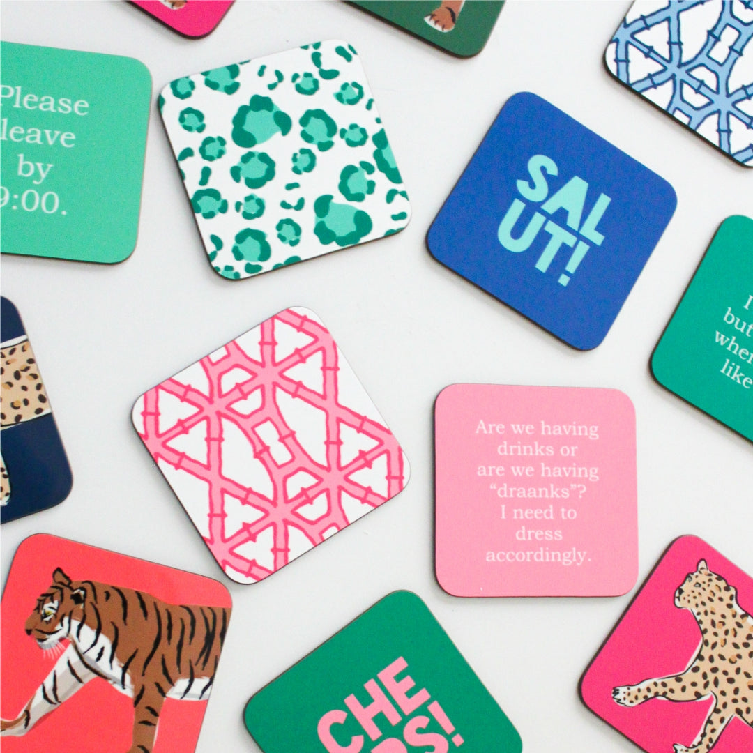 Our colorful coasters make great hostess gifts. Add them to your bar cart to give your guests a chuckle.
