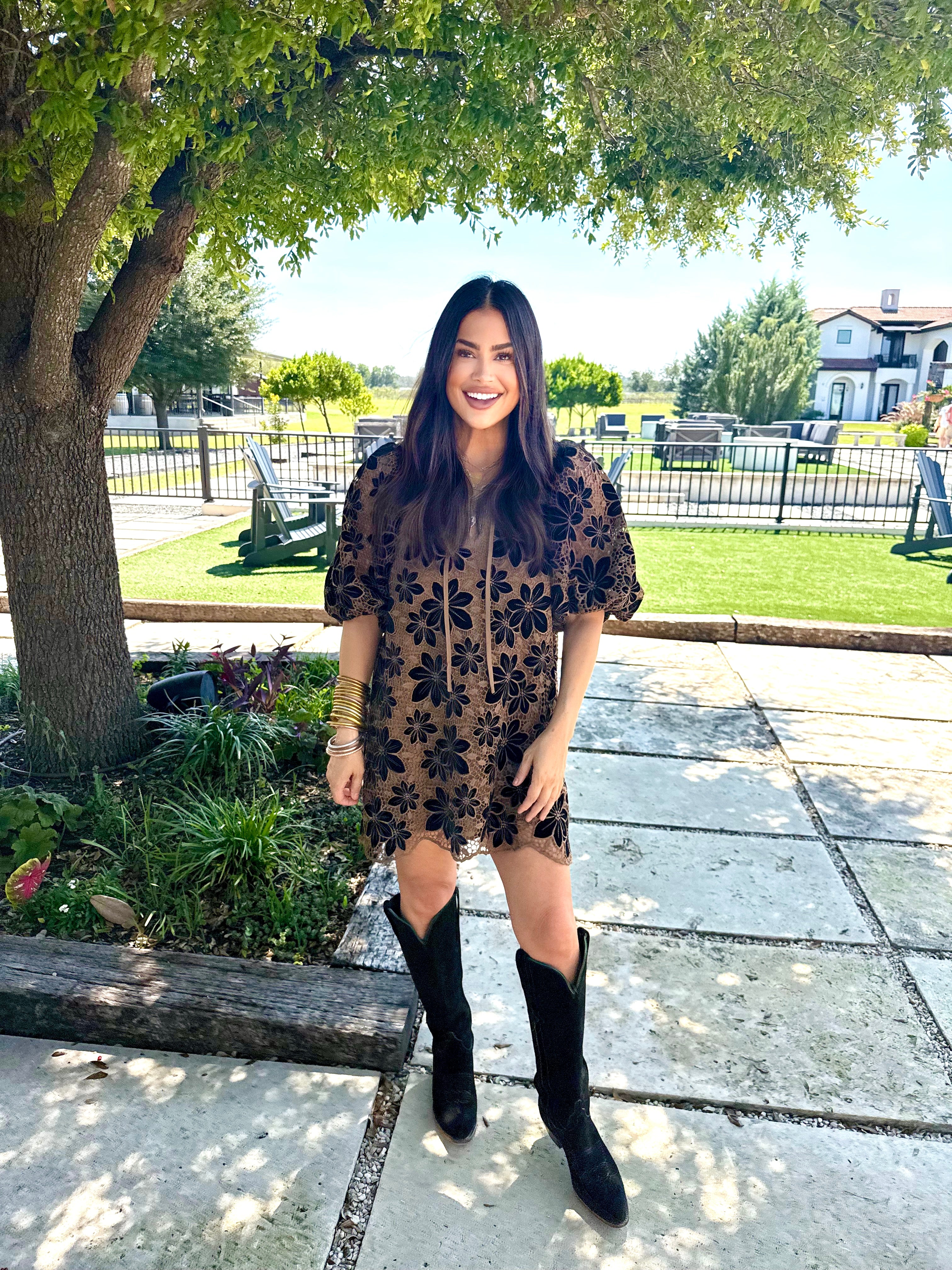 So lovely in lace and velvet, you'll wear it over and over again! Our Deb Mini Dress is a staple you need in your closet. She features a puff sleeve, v-neckline, flowy silhouette and the most gorgeous lace material! Pair her with boots or a heel for the perfect transitional look. Fabric is a brown/olive crochet color featuring black velvet flowers.