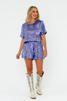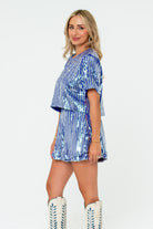You'll always be the center of attention when you've in the Laura Set! The Laura Set features a boxy short sleeve sequin cropped top with a key hole button closure and elastic waist band sequin shorts with a zipper closure in the back. The shorts also feature an extra ruffled layer on each side for a flattering fit.