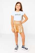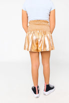 The smocked waist of our Eloise Shorts gives it a bold look, while the metallic shimmer adds a playful vibe! The elastic waistband makes it super comfy so your girl is twirling and taking on the day in style. Add her fav sneakers and graphic tee for the perfect playdate fit!