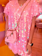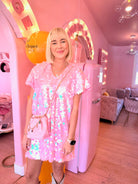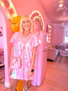 This is the perfect party pink dress featuring the iconic Brooke of Bubbles patch. This is a loose fitting V-neck swing dress. Runs generous & very comfortable. Be prepared for a million compliments!