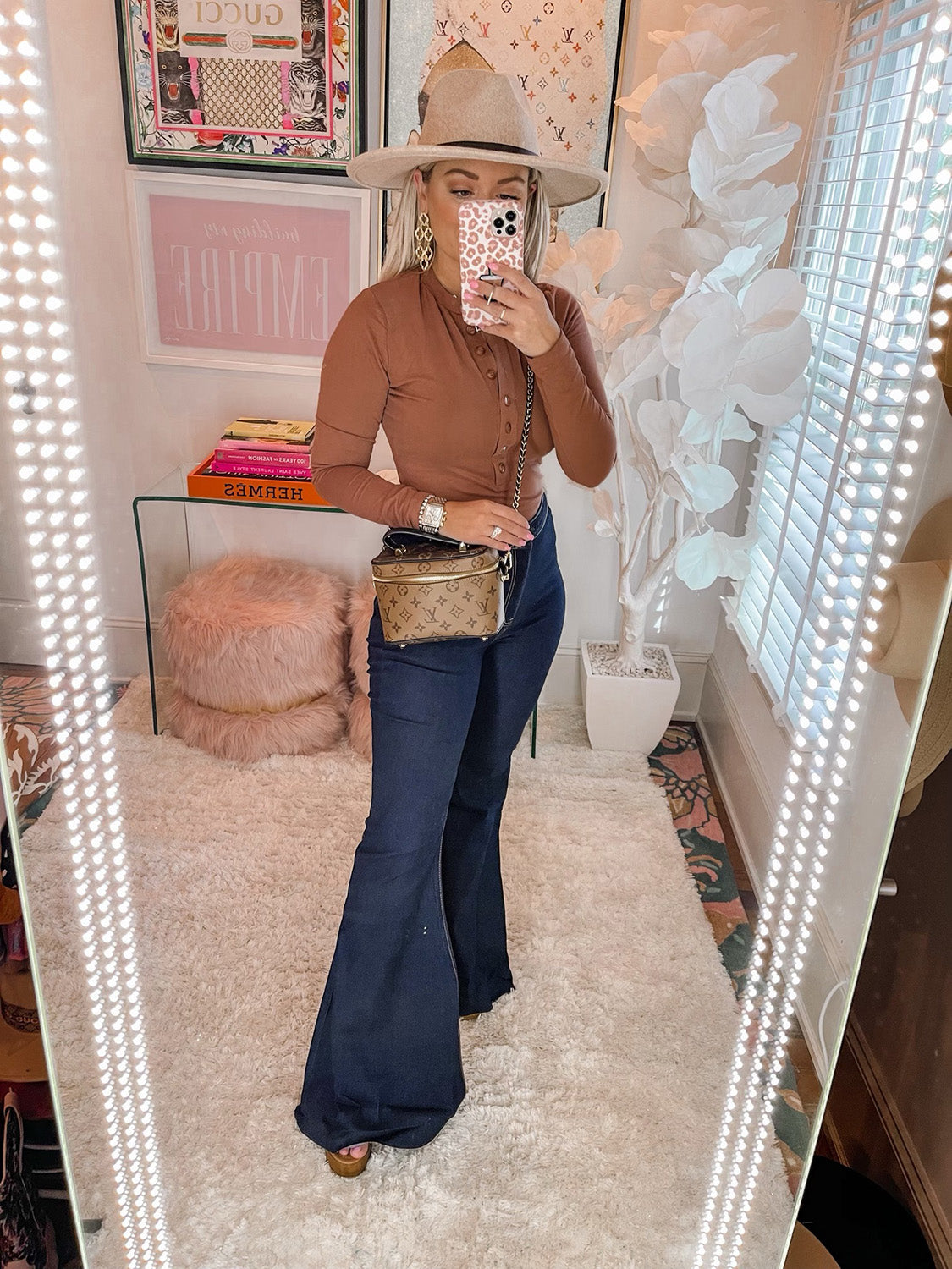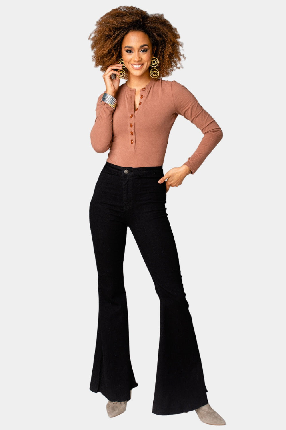 Accessorize your look from head to toe in this long sleeve button down bodysuit. This bodysuit is perfect for pairing with leggings and boots or heels for an ultimate look! Our Ivy bodysuit features button front detailing to allow a custom neckline, stretchy material to hug you in all the right places,  and button closure on the bottom! Pair her with our Moonshine Denim, Francesca Jacket and some statement earrings to complete your look!