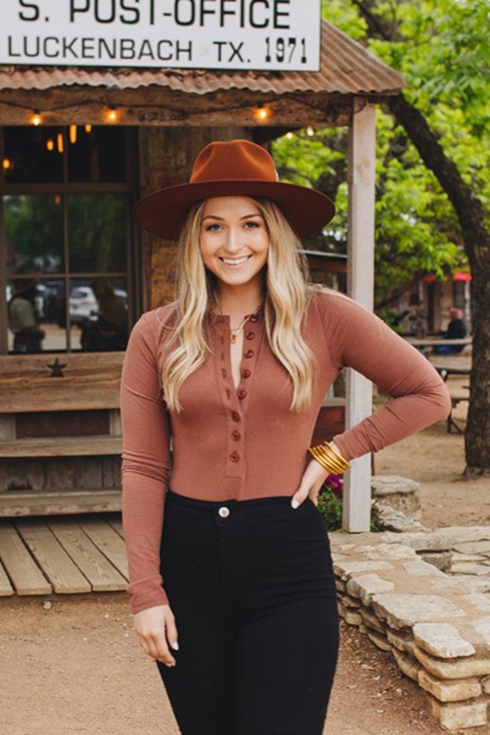 Ivy Henley Button Front Bodysuit - Brown