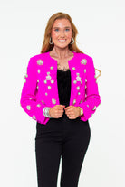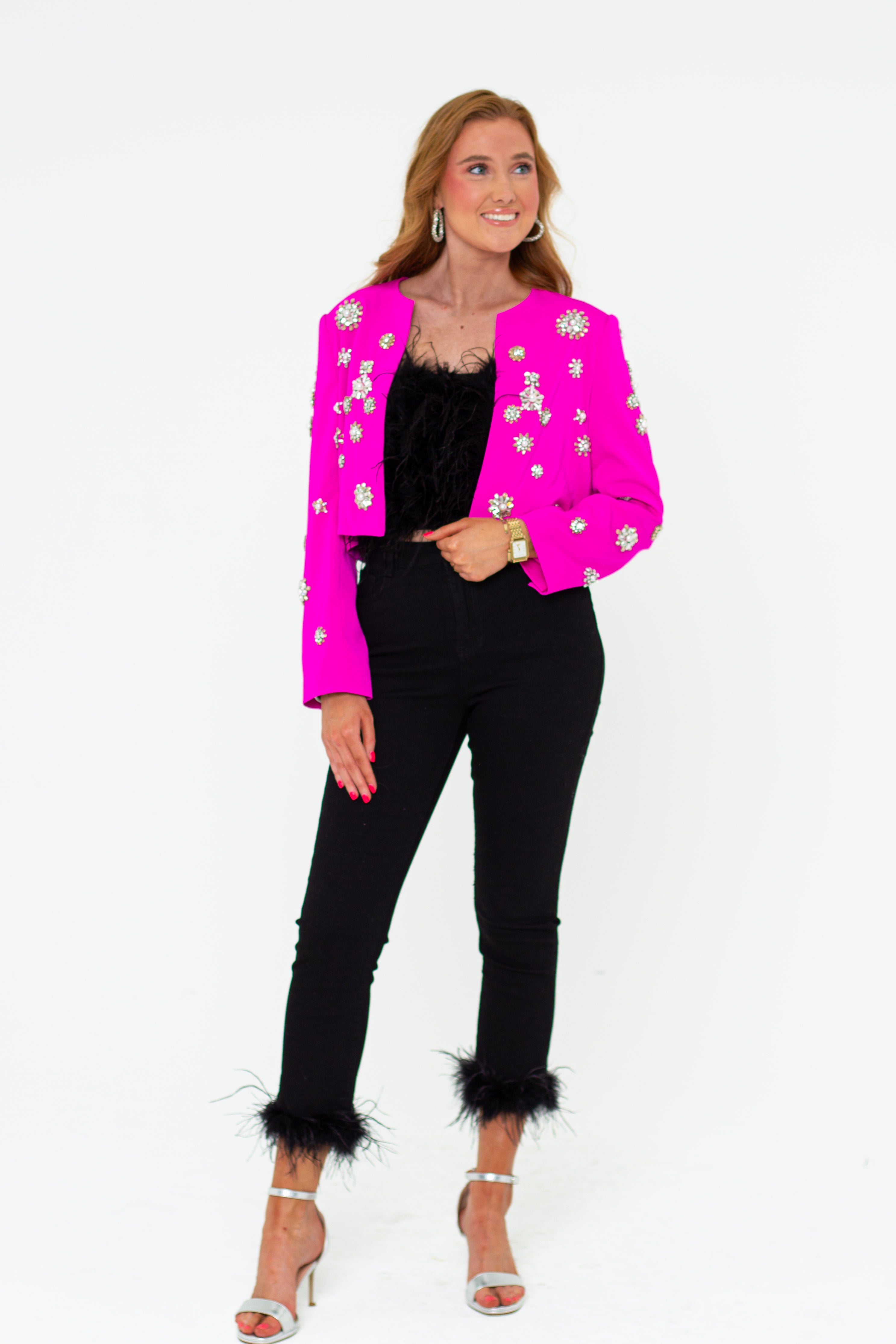 Step into the spotlight with our Jocelyn jacket, designed to make you shine. Crafted with elegance and flair, this blazer features stunning hand beaded details that catch the light beautifully, adding a touch of glam to any occasion.