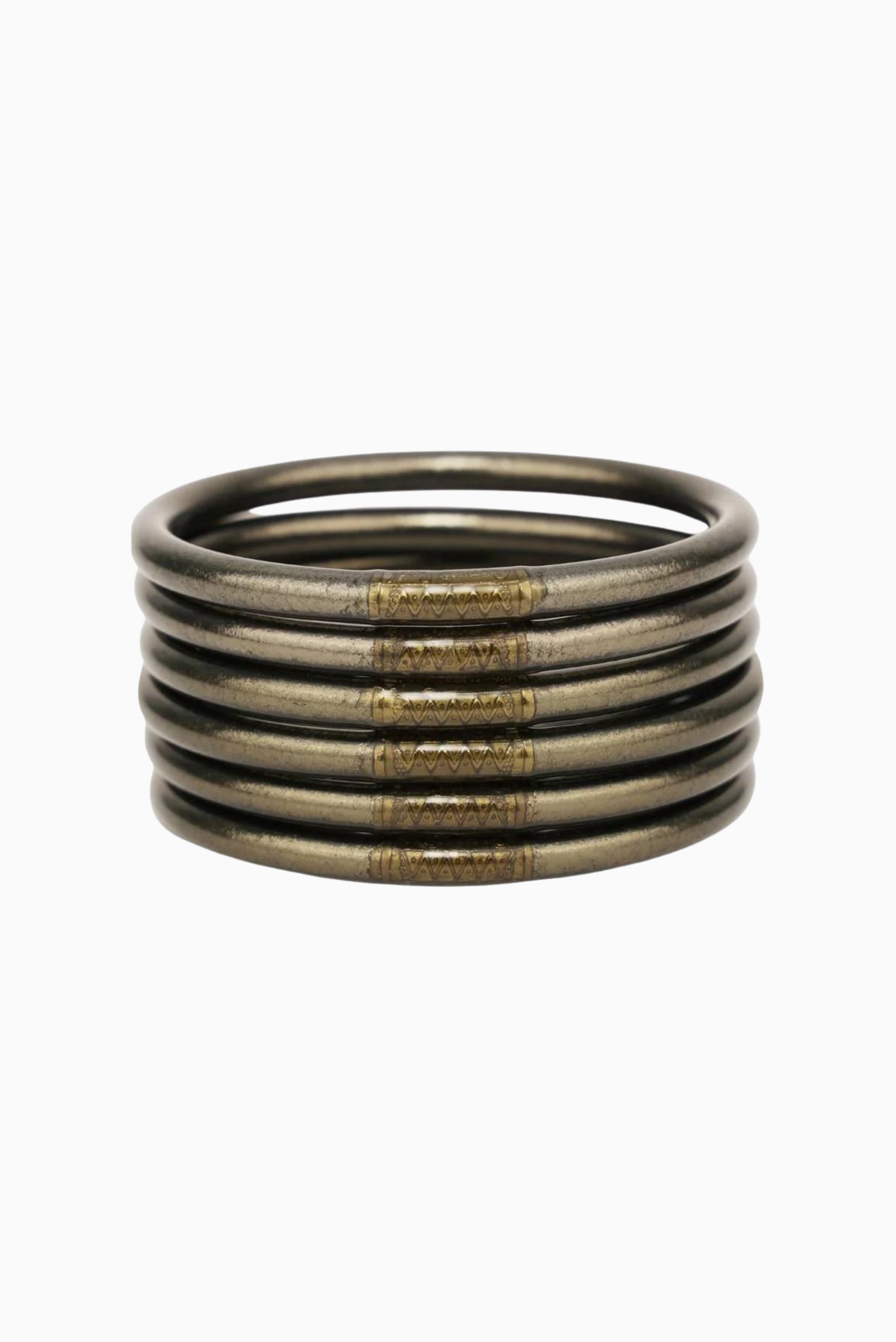 All Weather Bangles® (AWB®) are the force at BuDhaGirl. These amazing bangles are weightless, soundless, waterproof and TSA proof. Each of the six bangle bracelets in the set is meant to represent an intention for your day. As you put them on in the morning, affirm your intentions for your day, and when you remove them in the evening, fill yourself with thoughts of gratitude. This daily ritual will settle your mind at the beginning and end of each day. All Weather Bangles® (AWB®) are made of flexible, polyvinyl carbonate rings that are hand-filled with gold leaf and sealed with our exclusive BuDhaGirl Serenity Prayer bead. This unique, non-metal material allows you to go from the pool, to the office, and through the airport all without needing to take them off. All Weather Bangles® (AWB®) are beautifully packaged for you in our custom BuDhaGirl Silk All Weather Bangles box, included with your purchase.