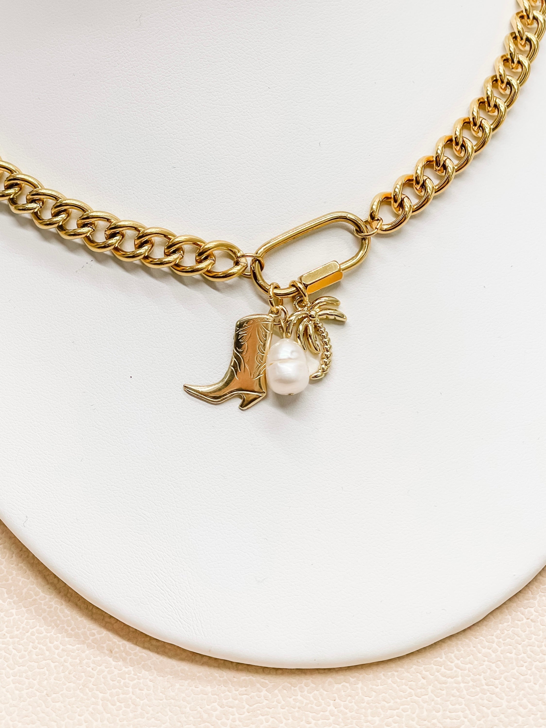 A classic carabiner paired with gorgeous curb chain made from high-quality 18k gold-plated titanium steel