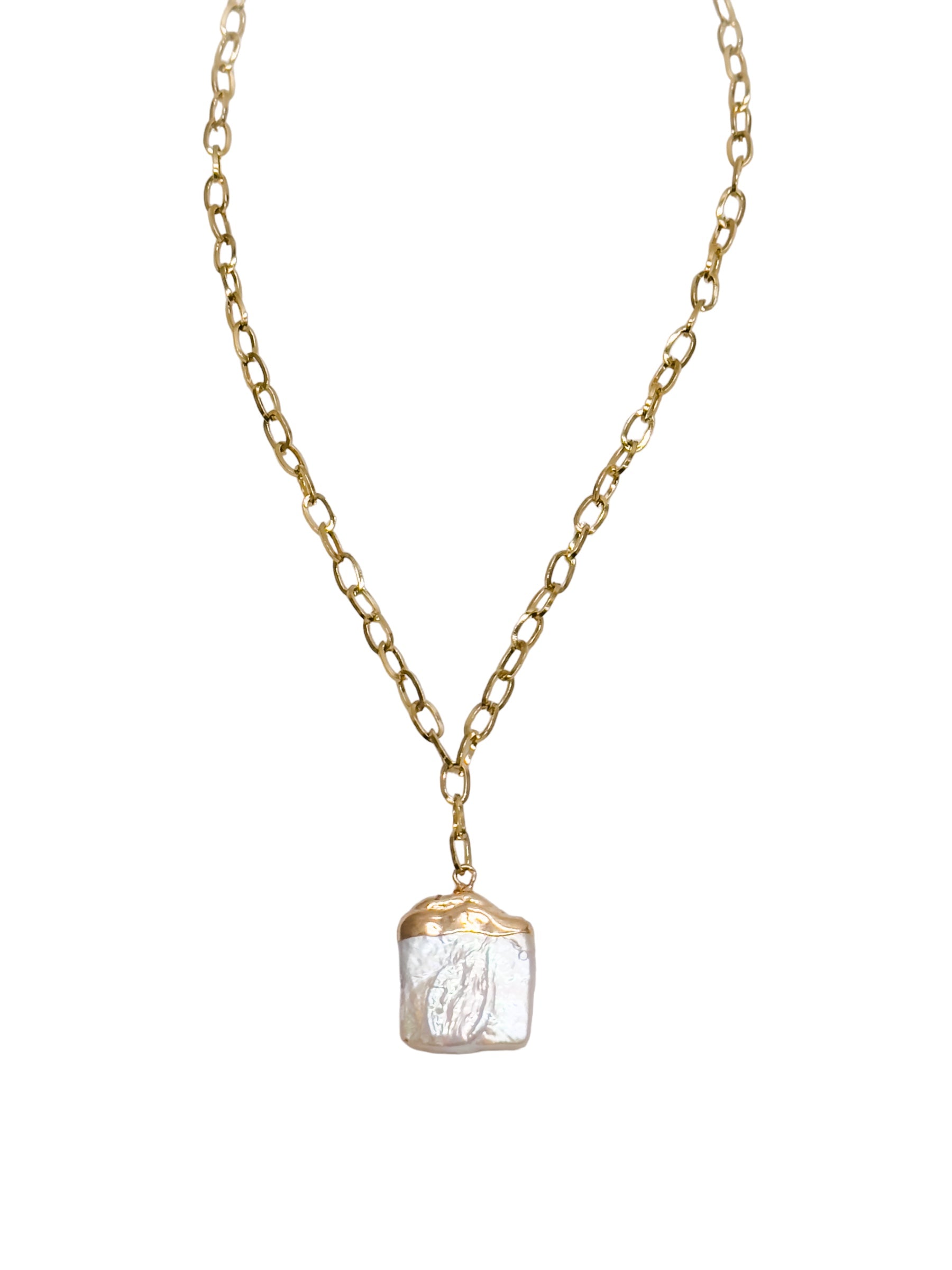 Indulge in quiet luxury with the Estelle Baroque Pearl Necklace. Handcrafted with a square baroque pearl and gold-plated steel chain in a Y design, this necklace exudes sophistication and elegance. Elevate your style with this exclusive piece that keeps simple and subtle.