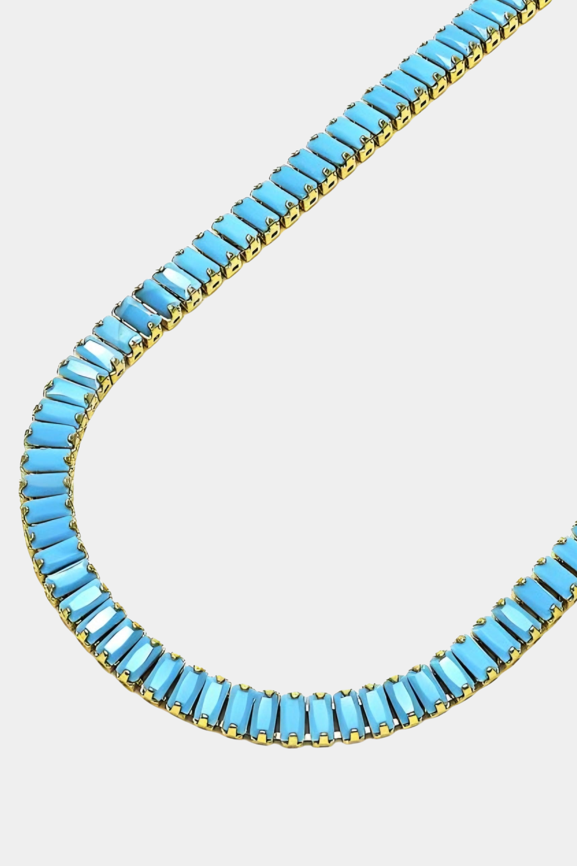 The Funny Girl Necklace features a rectangular turquoise-colored design. Durable and elegant, this necklace is perfect for any occasion.