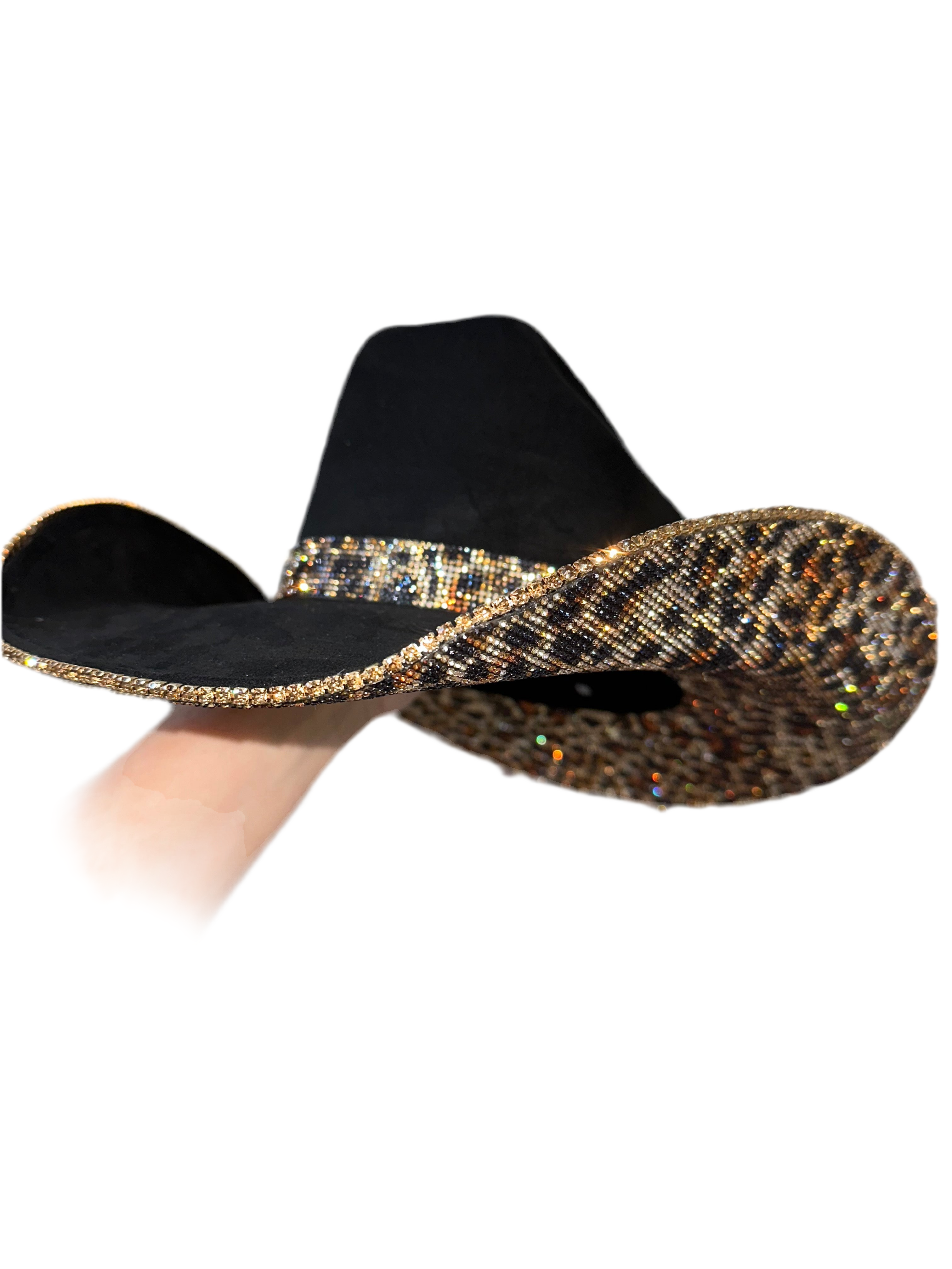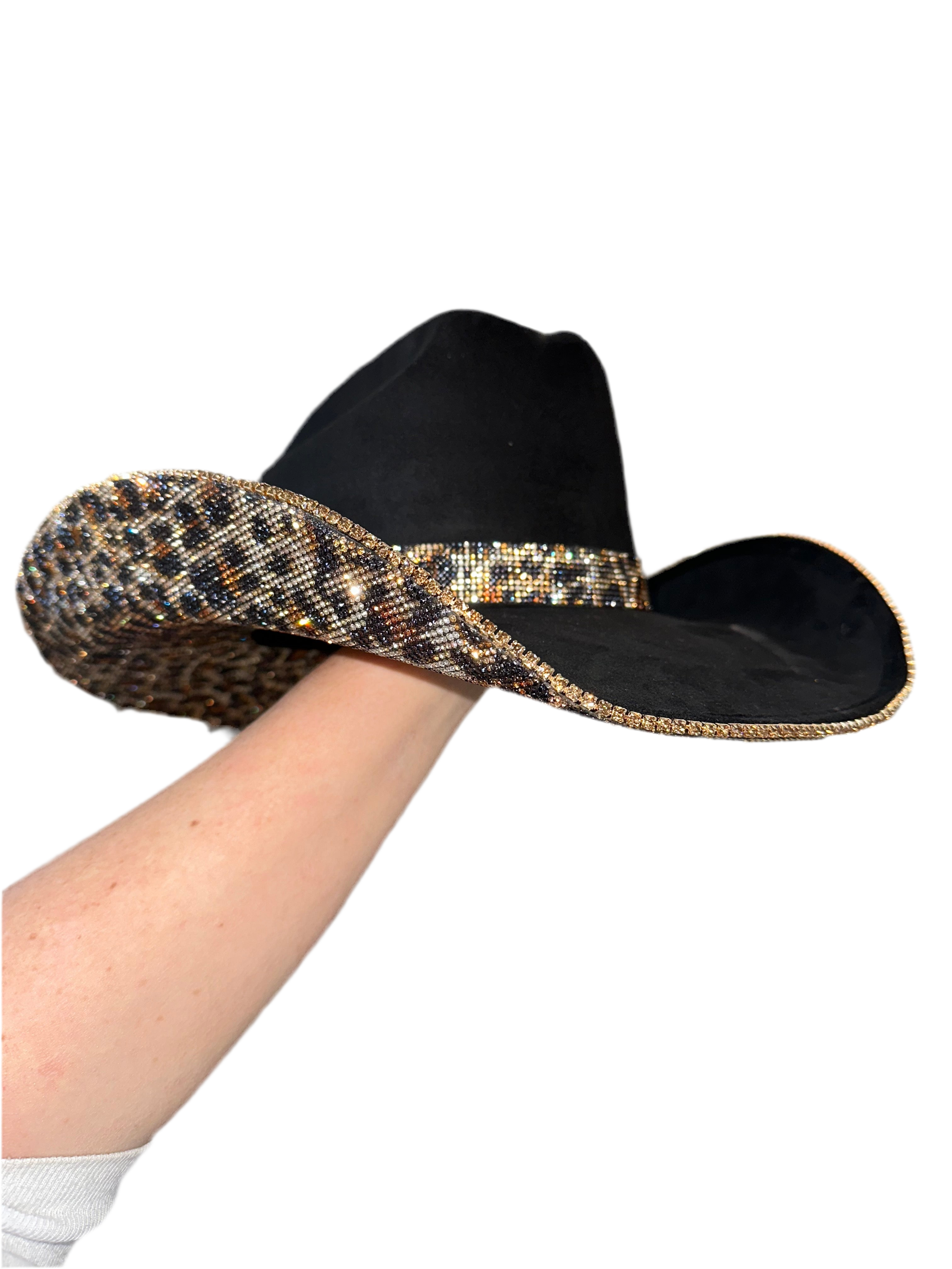 Black Suede Cowgirl Hat with Brown Leopard Rhinestones