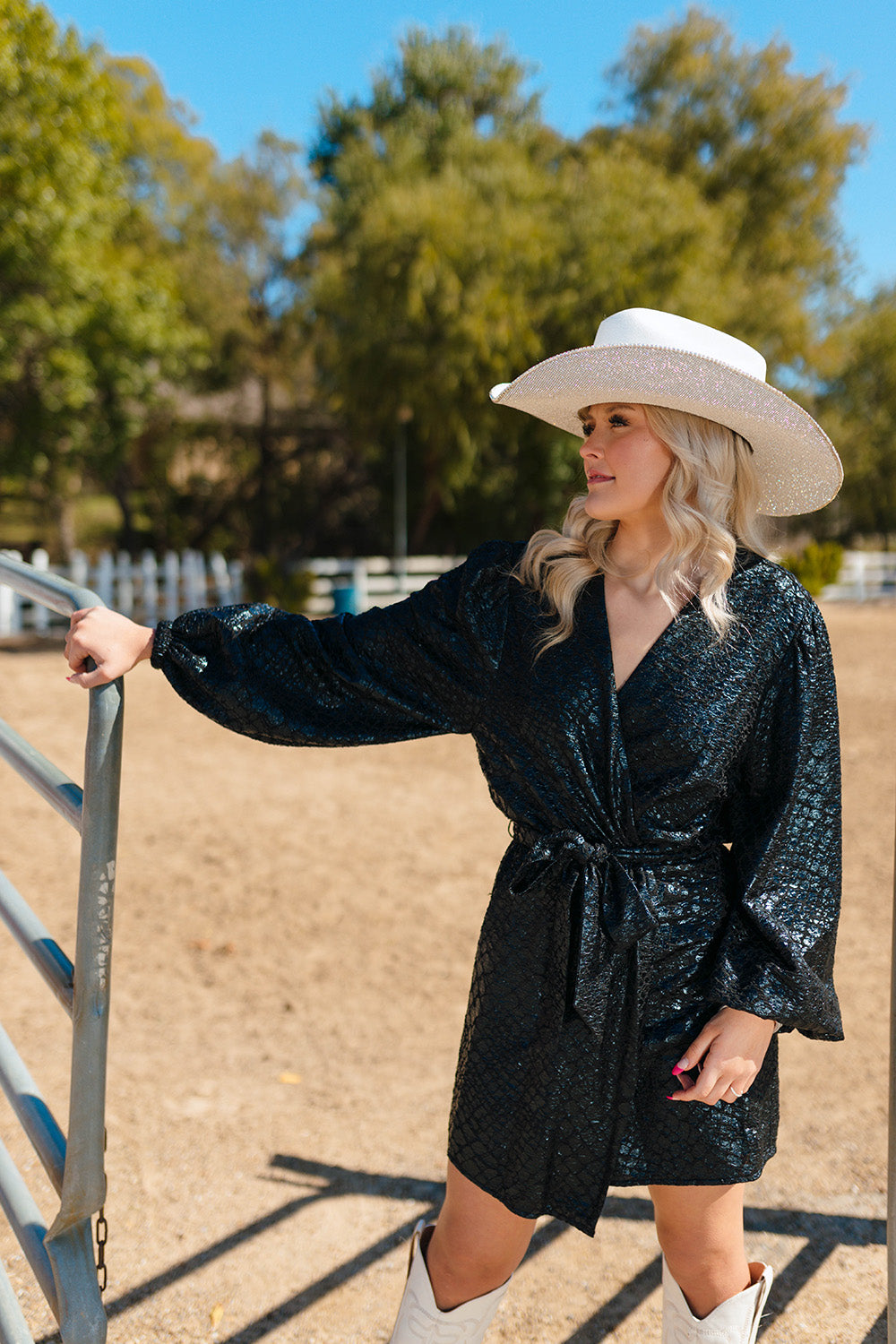 This Adeline Dress has us in our Reputation Era! The loose fit, wrap waist, and mid-thigh length allows you to be comfortable for your entire event and looking great while partying the night away! Pair with a bright color heel for a pop of color to accent the dress!