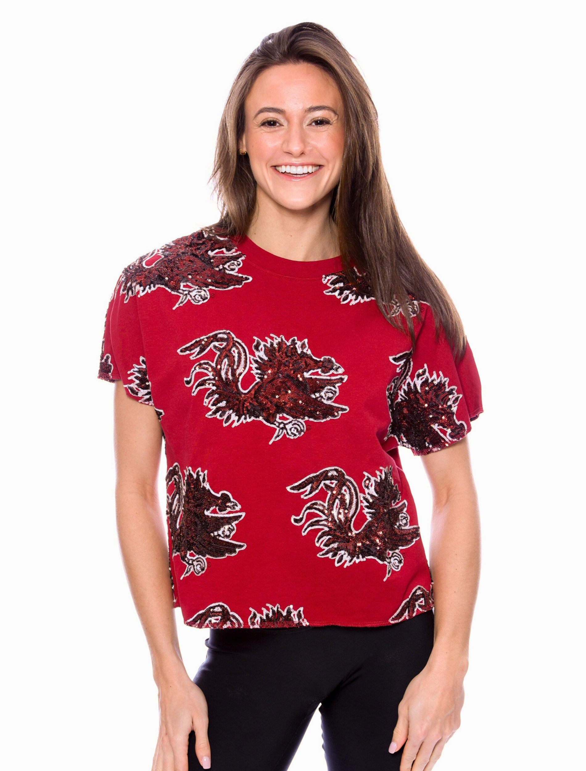 The ultimate statement piece, our sequin set top is made out of relaxed, French terry cotton and features repeating full sequin logos on the front and back of this top! This top is officially licensed so a portion of your purchase directly supports the university.