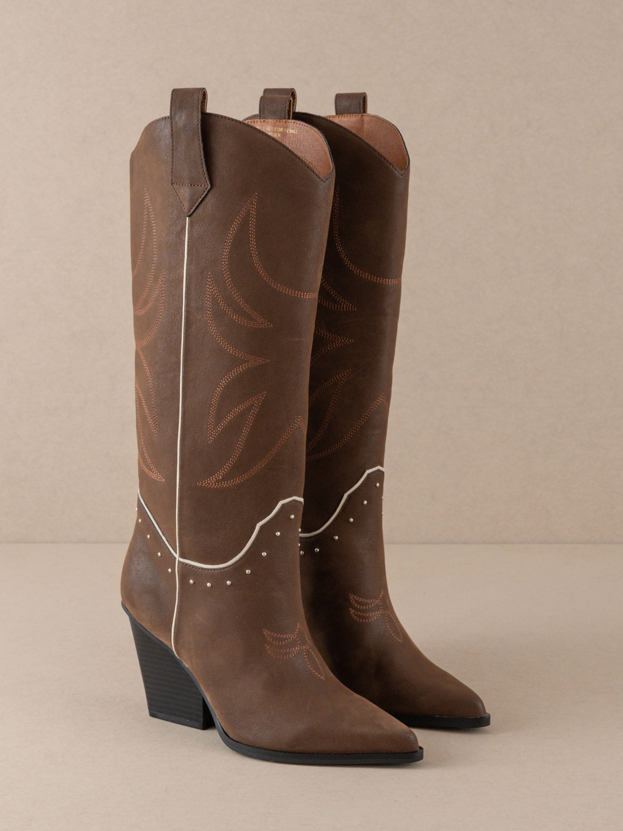 A tall western cowboy boot with detailed stitching, piping, and studded details.