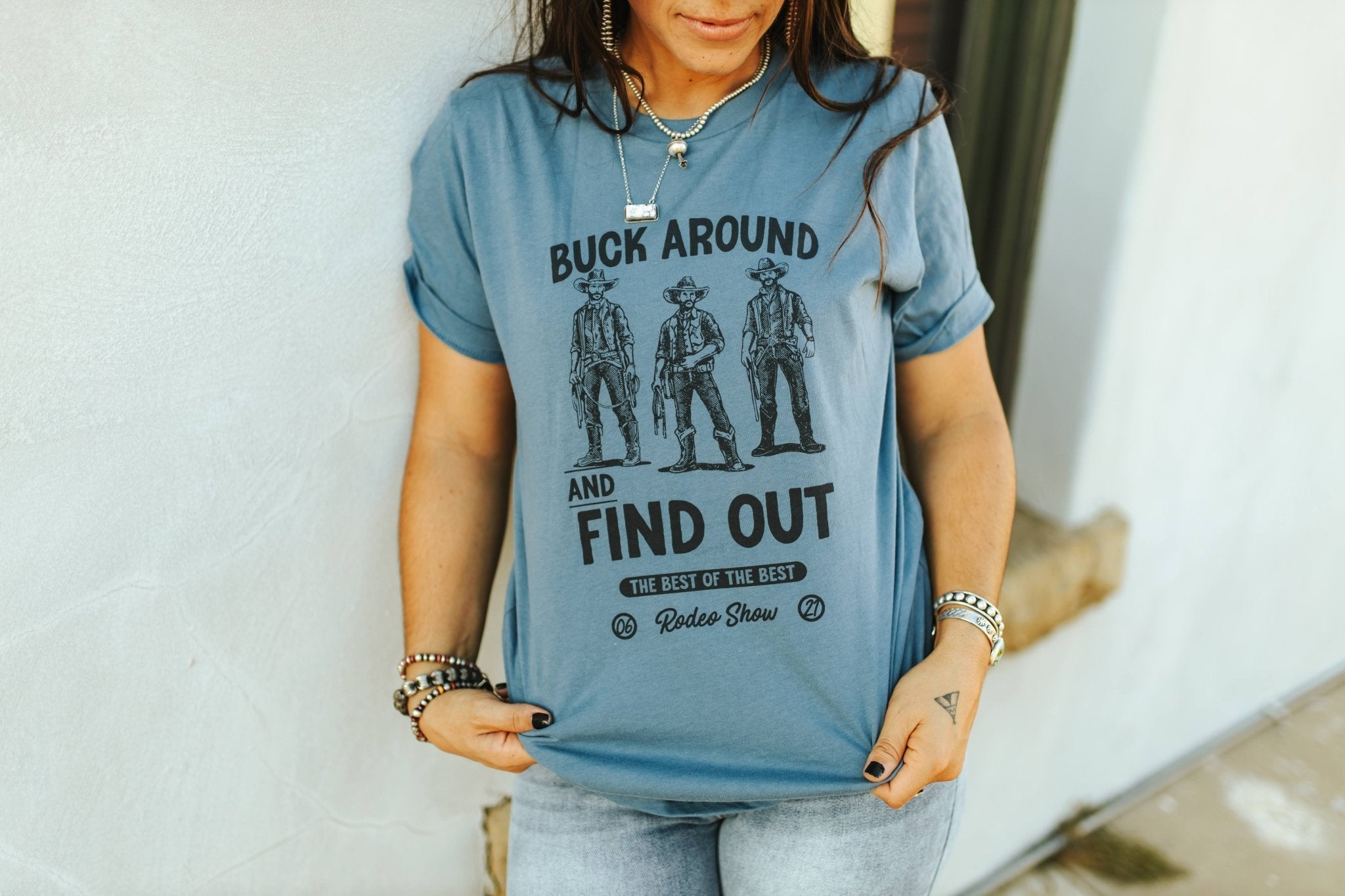 Ready to ride the wild side? Our "Buck Around and Find Out" tee is for the fearless and adventurous. It's a bold statement that says you're not afraid to take on life's challenges head-on.