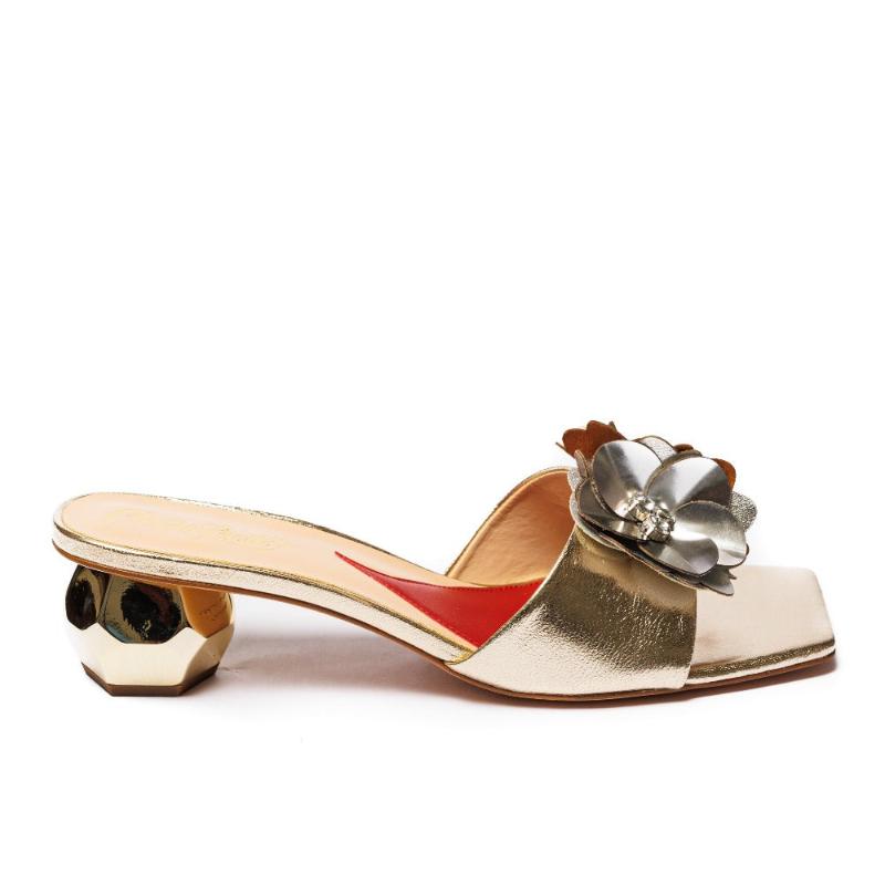 Introducing Delilah, the gold and chrome, octagon-shaped heel slide that exudes luxury and sophistication. Perfect designer shoes for parties, these stunning metallic gold leather slides are versatile enough for both day and night events.