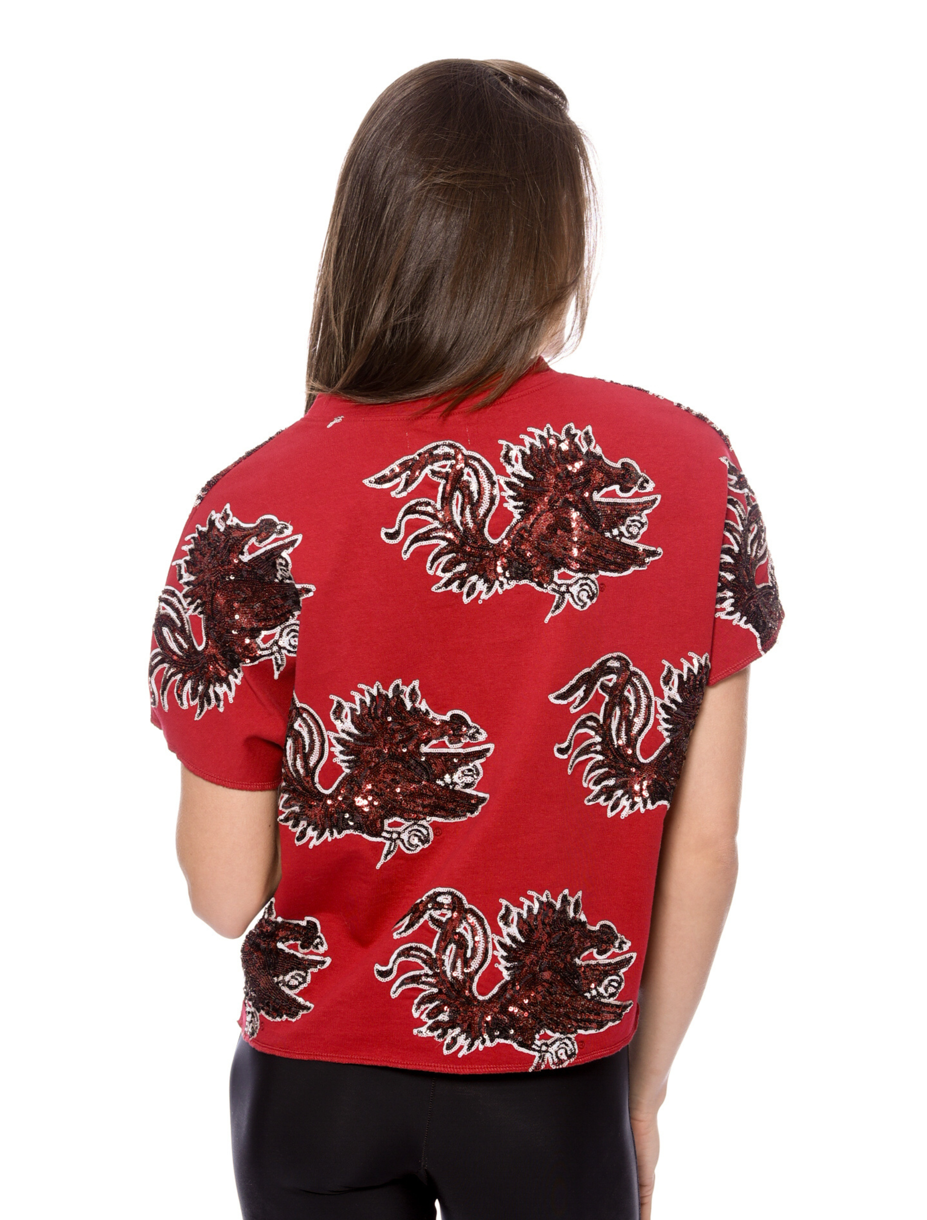 The ultimate statement piece, our sequin set top is made out of relaxed, French terry cotton and features repeating full sequin logos on the front and back of this top! This top is officially licensed so a portion of your purchase directly supports the university.